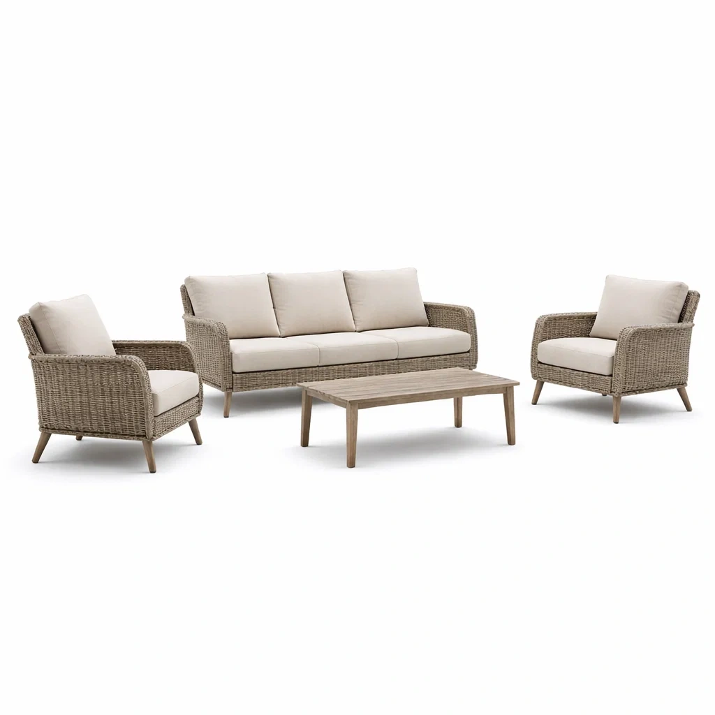 Ensemble de canapés de jardin en résine tressée et bois avec coussins beige