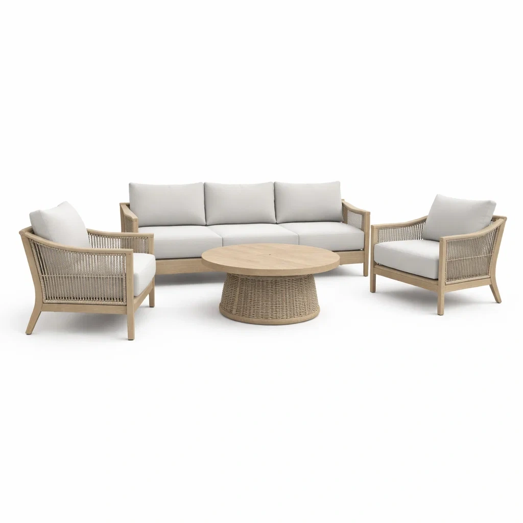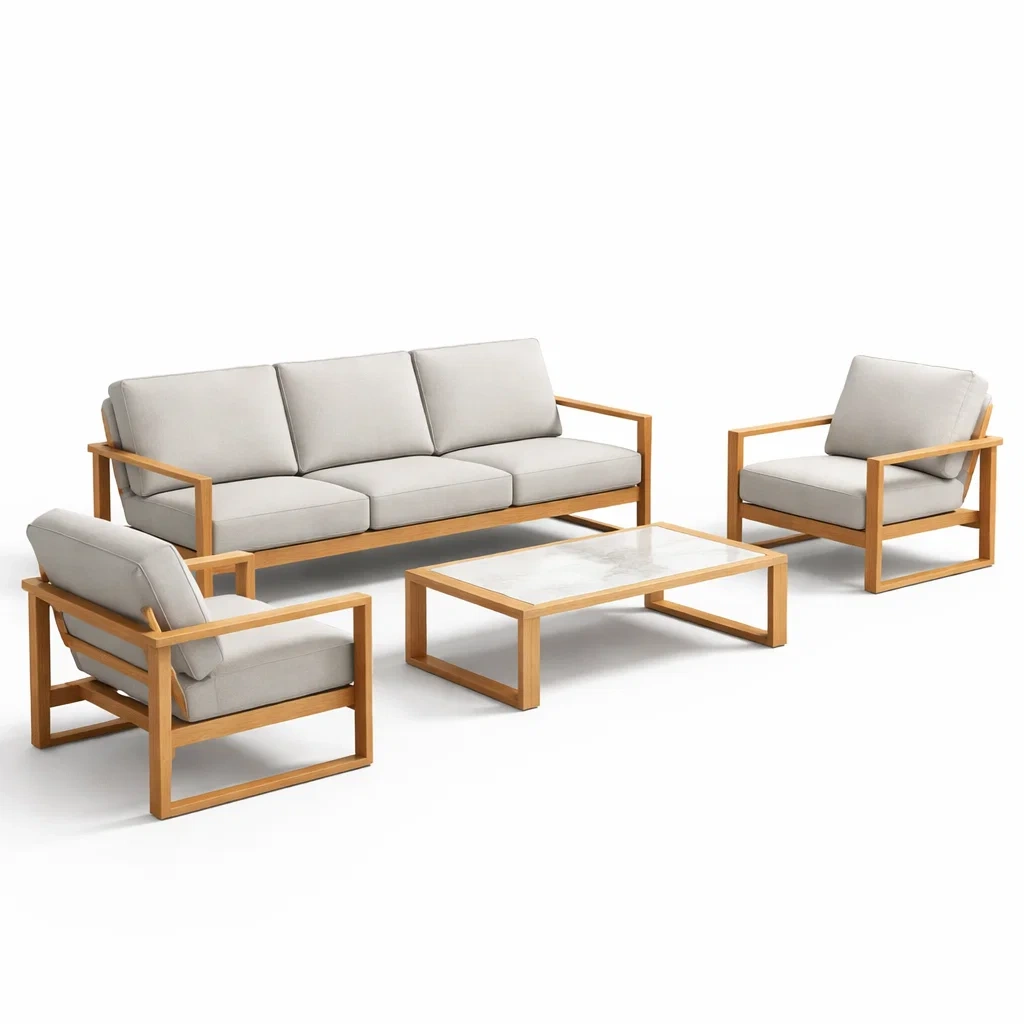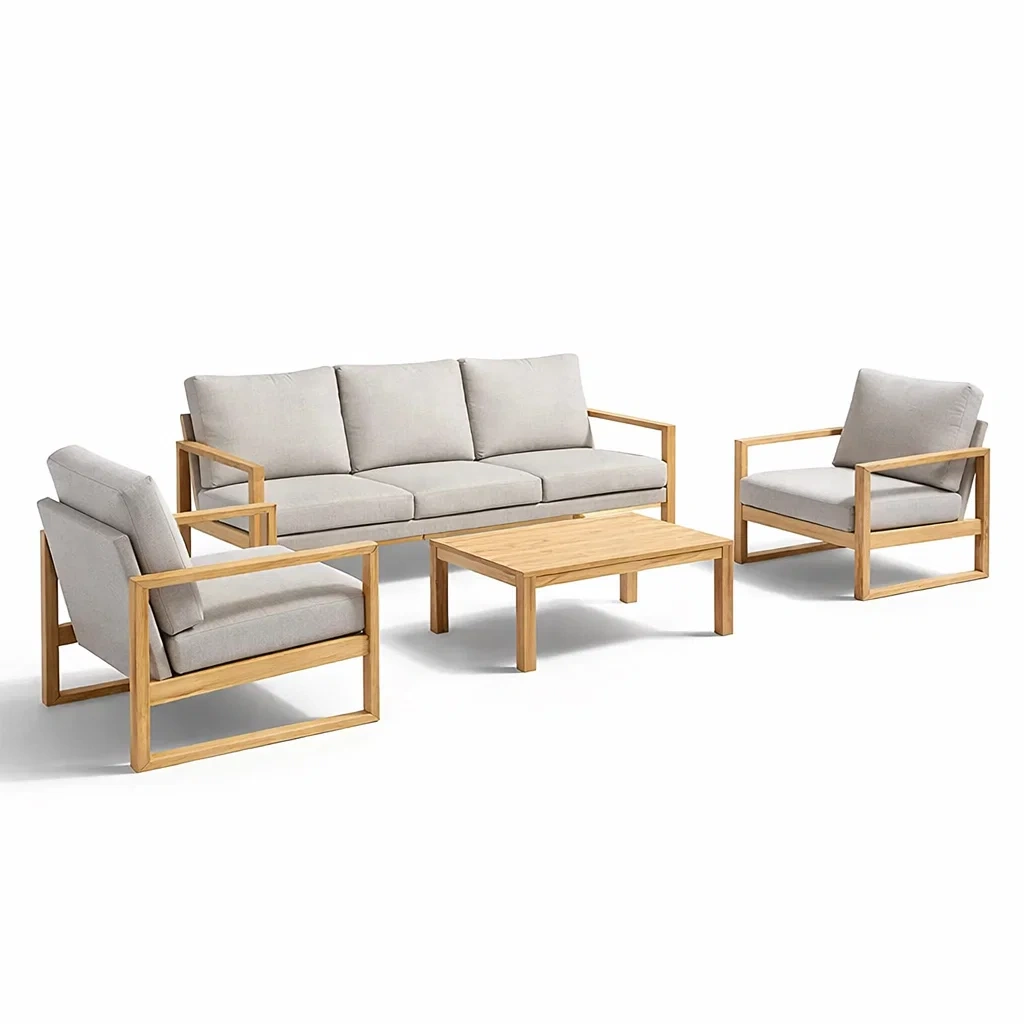 Ensemble de canapés avec canapé et fauteuils en bois et coussins beige