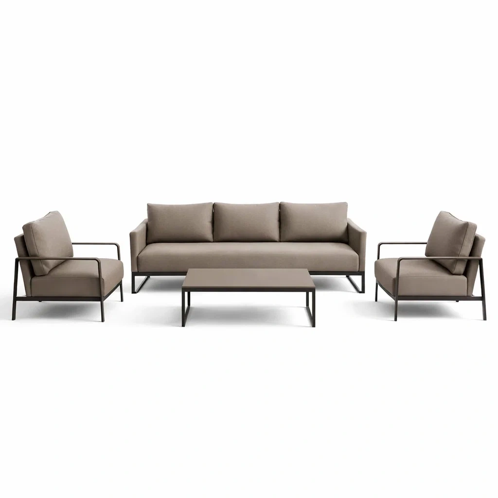 Matériau : Cadre en aluminium, coussins en tissu polyester, table en aluminium avec revêtement.