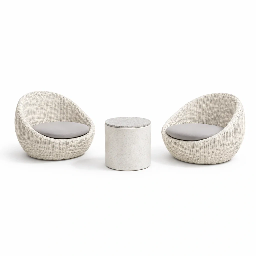 Ensemble comprenant 2 fauteuils et 1 table. Les fauteuils sont en résine tressée avec une structure en aluminium. Les coussins sont en polyester gris. La table est fabriquée en ciment de couleur beige.