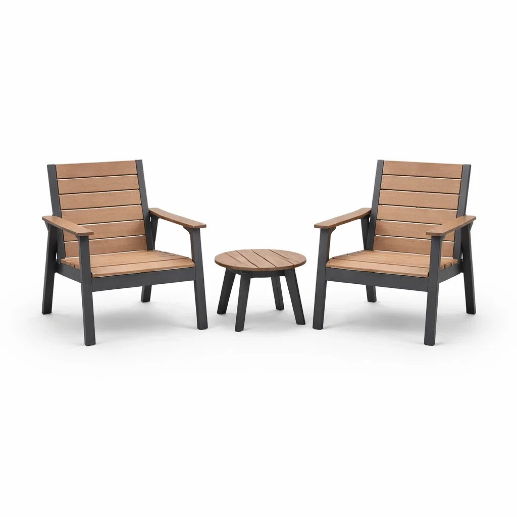 Les matériaux utilisés sont le polywood pour le siège et le plateau de la table, ainsi que l'aluminium pour la structure des chaises et les pieds de la table. Les chaises et la table sont de couleur brun/noir. Dimensions : chaises 85 cm de hauteur, 60 cm de largeur, 70 cm de profondeur ; table 40 cm de hauteur, 50 cm de diamètre. Poids : chaque chaise 8 kg, table 5 kg.