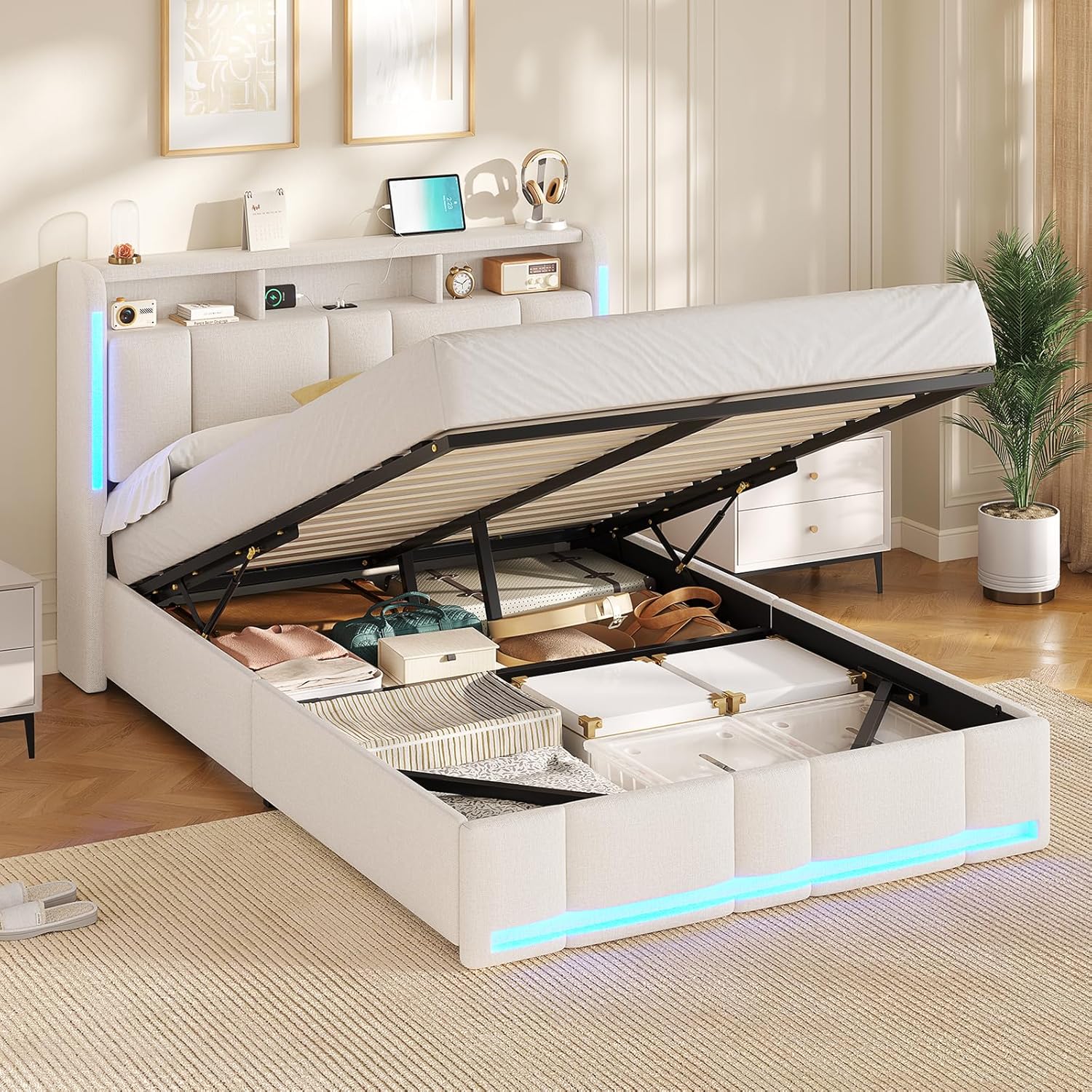 Ce lit coffre est doté d'un mécanisme de levage hydraulique permettant de soulever facilement le sommier 140x190. Un espace de 30 cm sous le lit offre un rangement pratique pour valises, boîtes et vêtements. La tête de lit dispose d'une multiprise avec ports USB pour charger vos appareils. Elle est également rembourrée pour un confort supplémentaire. Le lit est équipé de bandes LED modulables sur les côtés de la tête, dont la couleur et l'intensité peuvent être ajustées via une télécommande et une application. Composé d'un cadre en métal et de lattes en bois, ce lit assure solidité et stabilité. Les bandes EVA réduisent les bruits pour un sommeil paisible. L'assemblage est facilité grâce à une notice claire.