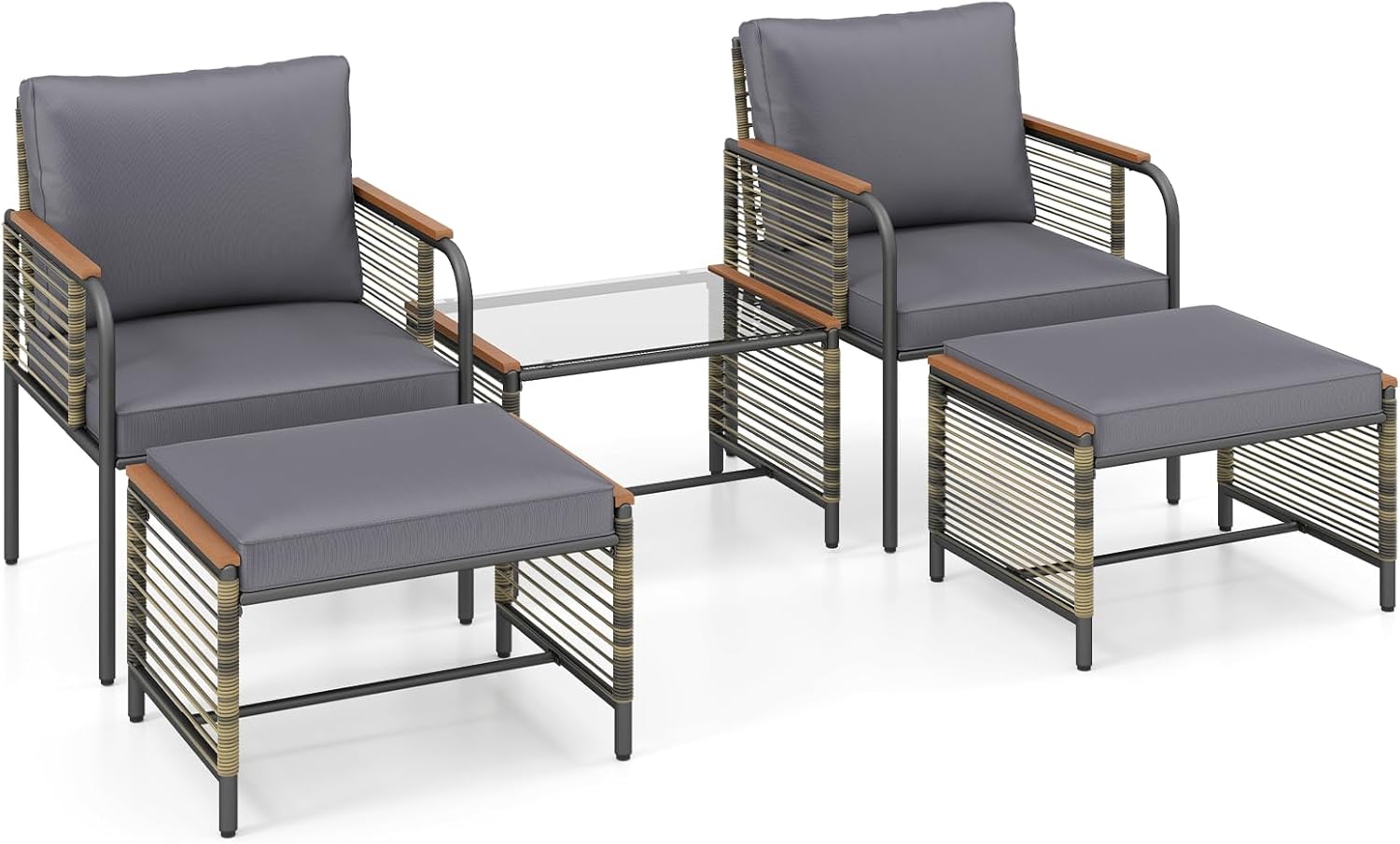 Les chaises possèdent des accoudoirs ergonomiques et des dossiers inclinés qui suivent les courbes du corps. Les ottomanes permettent de reposer les jambes et les pieds. Les coussins légèrement rembourrés offrent un confort continu. La table basse a un plateau en verre trempé, solidement fixé au cadre par des ventouses. Sa surface est facile à nettoyer. La hauteur de la table permet d'avoir les objets à portée de main. L'ensemble de jardin 5 pièces est conçu avec un cadre métallique renforcé, offrant durabilité et solidité. Des patins réglables permettent de s'adapter aux terrains irréguliers. Le rotin PE utilisé est résistant au soleil, adapté à une utilisation extérieure prolongée. Le tressage à la main donne au set une esthétique naturelle pour compléter divers espaces. Ce mobilier est adapté pour se détendre, discuter ou se relaxer. Convient aux terrasses, patios, balcons et vérandas. Note : Pour prolonger sa durée de vie, éviter l'exposition prolongée à la pluie.